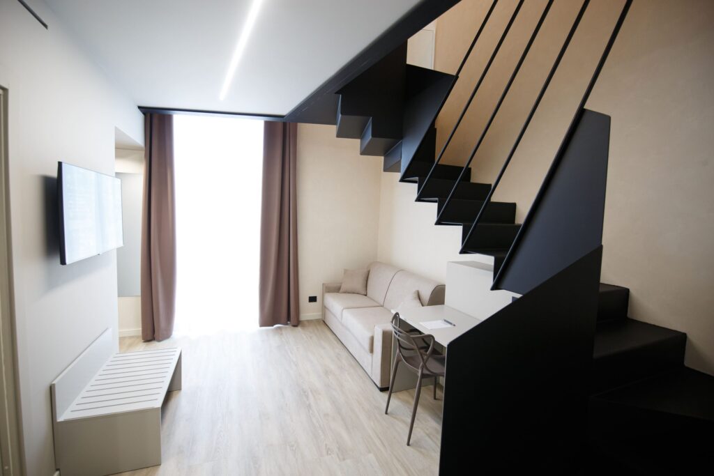 La stanza Bufalino è una quadrupla che si sviluppa su due livelli. Al primo troviamo una zona soggiorno con divano letto con bagno privato e affaccio balconato sulla piazza principale. Tramite un corpo scala in stile moderno si accede al livello superiore dotato di un letto matrimoniale alla francese.