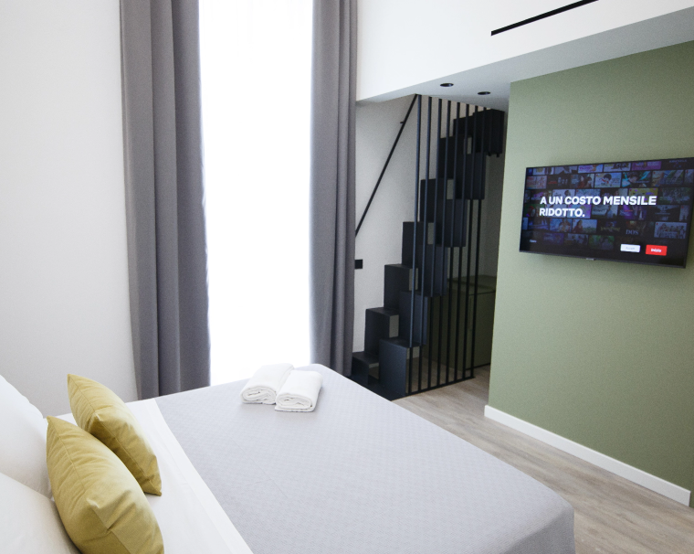 La stanza Camilleri è una quadrupla che si sviluppa su due livelli. Al primo troviamo un letto matrimoniale alla francese con bagno in camera e affaccio balconato sulla piazza principale.Tramite un corpo scala di design si accede al livello superiore dotato di due letti singoli.