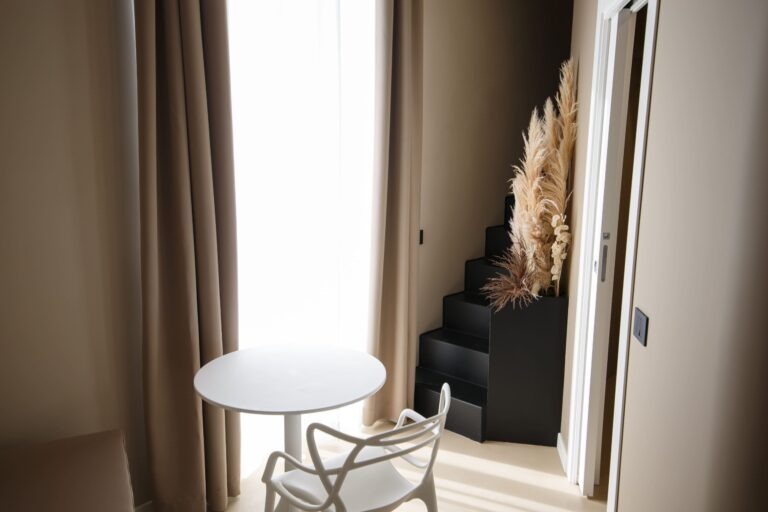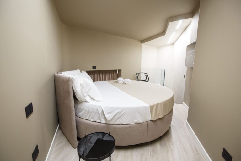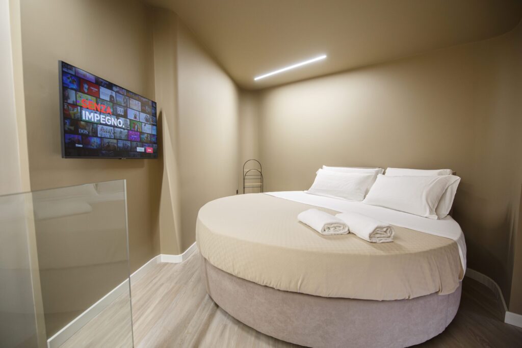 La stanza Sciascia è una matrimoniale che si sviluppa su due livelli. Al primo troviamo una zona soggiorno con bagno privato e affaccio balconato sulla piazza principale. Tramite un corpo scala in stile moderno si accede al livello superiore dotato di un letto matrimoniale di forma rotonda, che conferisce uno stile particolare alla camera.